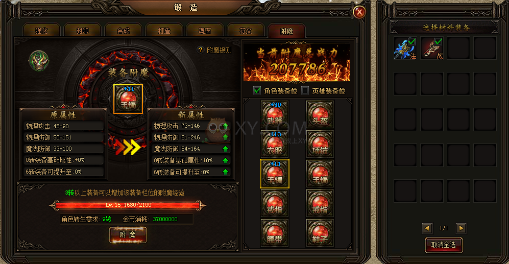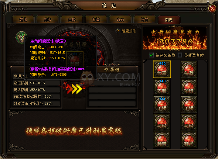 消耗3转以上装备,为角色/英雄装备栏位提供附魔经验。附魔经验达到一定值后,该装备栏位魔符等级提升。