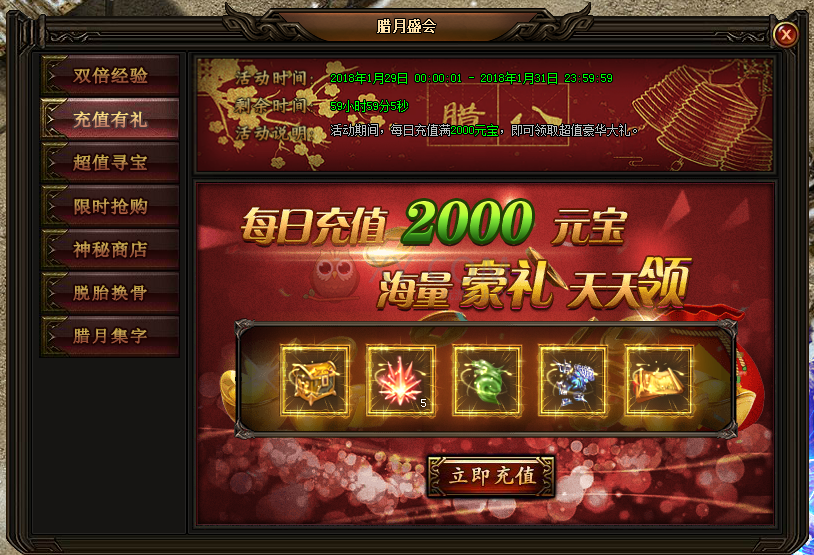 2.活动期间,每日充值2000元宝,即可领取超值豪华大礼