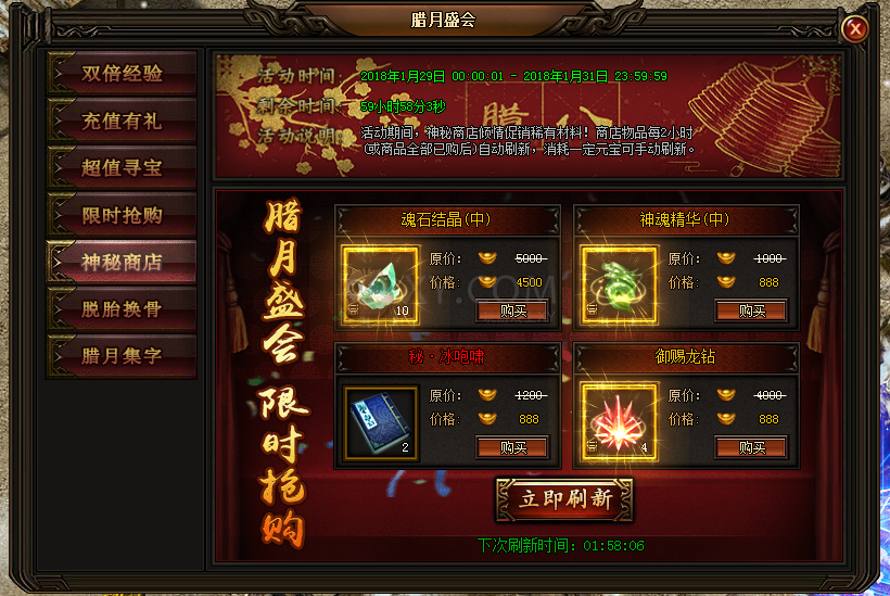5.活动期间,神秘商店促销稀有材料!商店物品每2小时或商品全部购买后自动刷新,也可消耗一定元宝手动刷新!