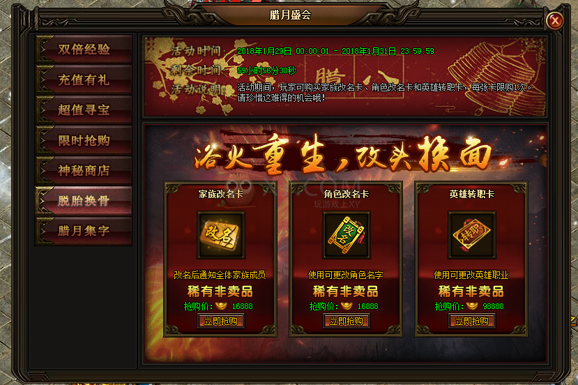 6.活动期间,可购买家族改名卡、角色改名卡和英雄转职卡,每张卡限购1次,预购从速!