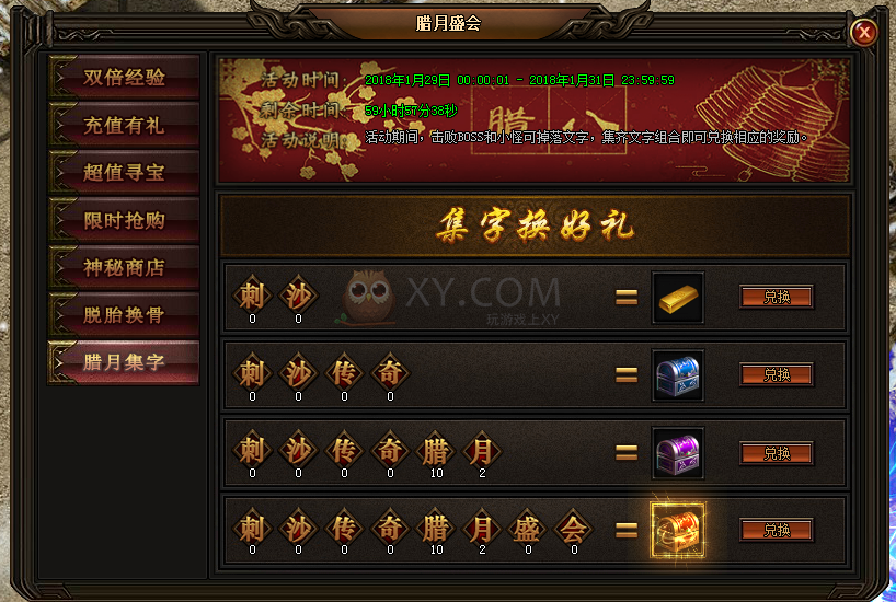 7.活动期间,击败BOSS和小怪可掉落文字,也可在积分装备处兑换稀有文字,集齐文字组合即可兑换相应的奖励