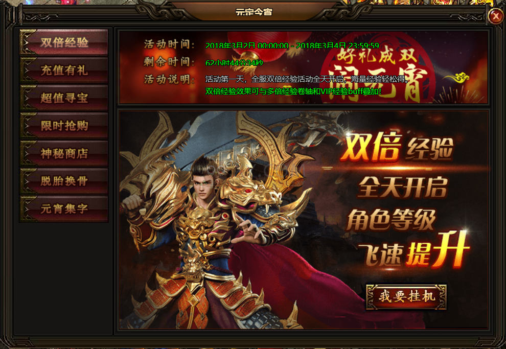 1. 活动期间,全服双倍经验全天开启,可与多倍经验卷轴和VIP经验BUFF完美叠加!