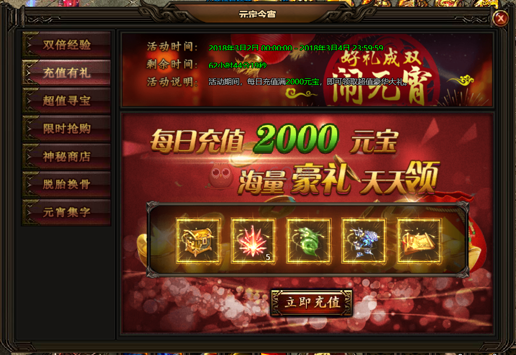 2.活动期间,每日充值2000元宝,即可领取超值豪华大礼