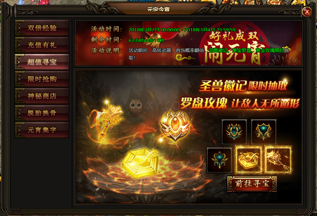 3.活动期间,3月2日至3月4日,高转武器、首饰概率翻倍,圣兽徽记、黄金玫瑰、黄金罗盘限时抽取!