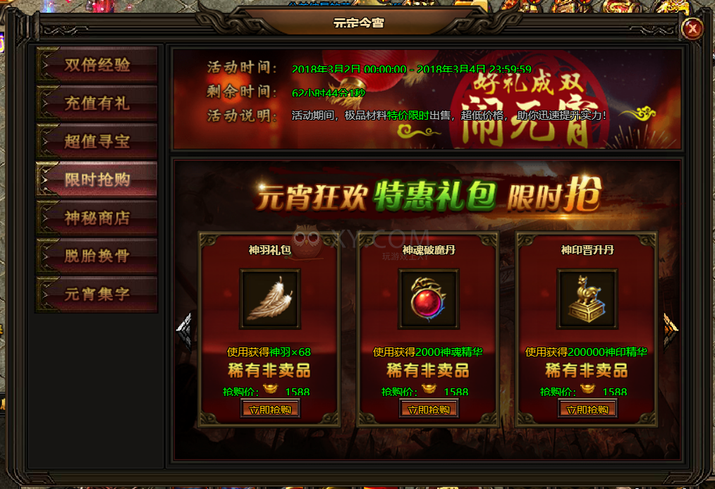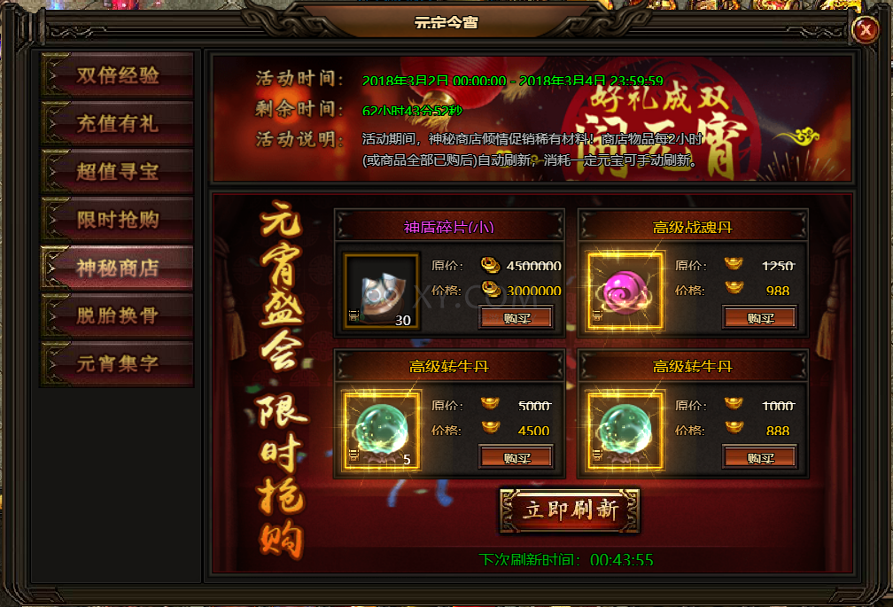 5.活动期间,神秘商店促销稀有材料!商店物品每2小时或商品全部购买后自动刷新,也可消耗一定元宝手动刷新!