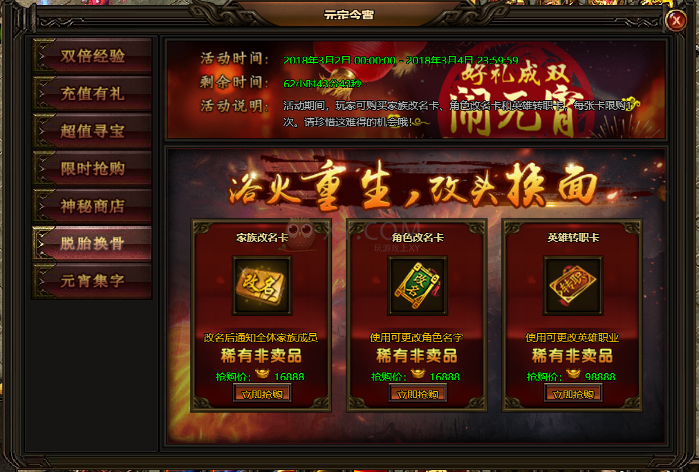6.活动期间,可购买家族改名卡、角色改名卡和英雄转职卡,每张卡限购1次,预购从速!