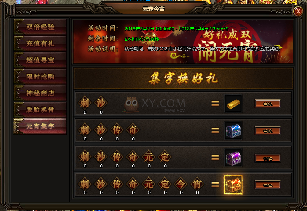 7.活动期间,击败BOSS和小怪可掉落文字,也可在积分装备处兑换稀有文字,集齐文字组合即可兑换相应的奖励