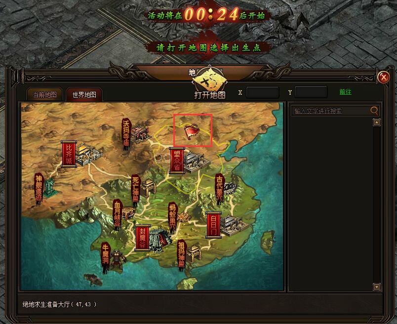 进入活动后30秒,所有人集中于准备大厅,可在大地图上选择出生点;30秒倒计时后,所有玩家出生在已选择的出生地图随意位置(未选择出生点的玩家将会随机传送)