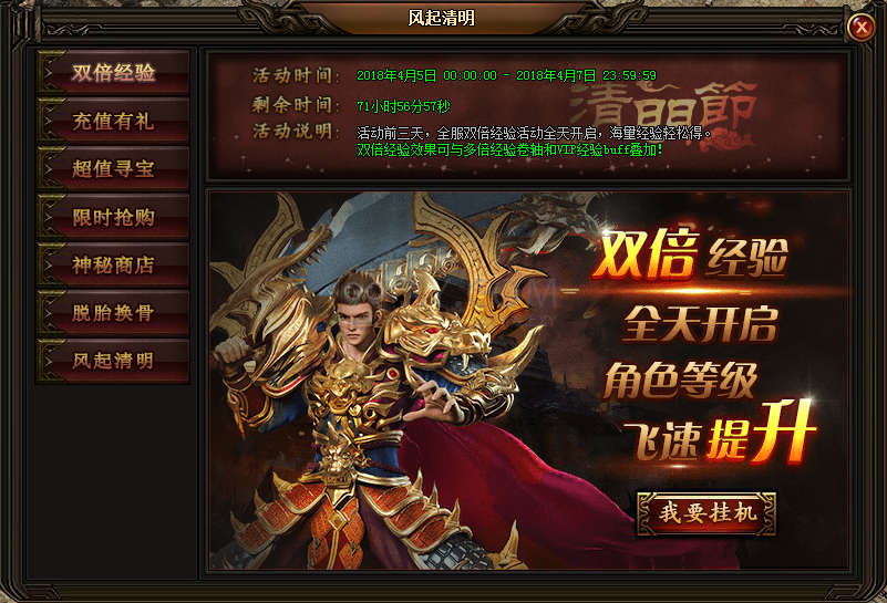 1.4月5日至4月7日,全服双倍经验全天开启,可与多倍经验卷轴和VIP经验BUFF完美叠加!