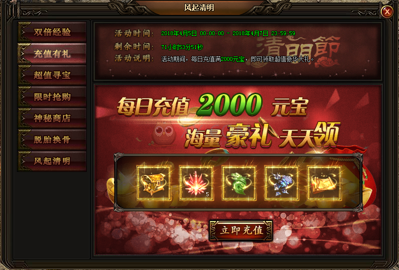 2. 4月5日至4月7日,每日充值2000元宝,即可领取超值豪华大礼