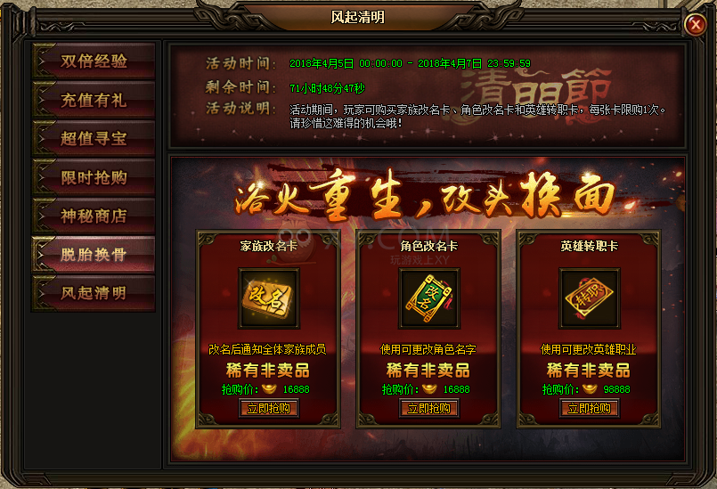 6. 4月5日至4月7日,可购买家族改名卡、角色改名卡和英雄转职卡,每张卡限购1次,预购从速!