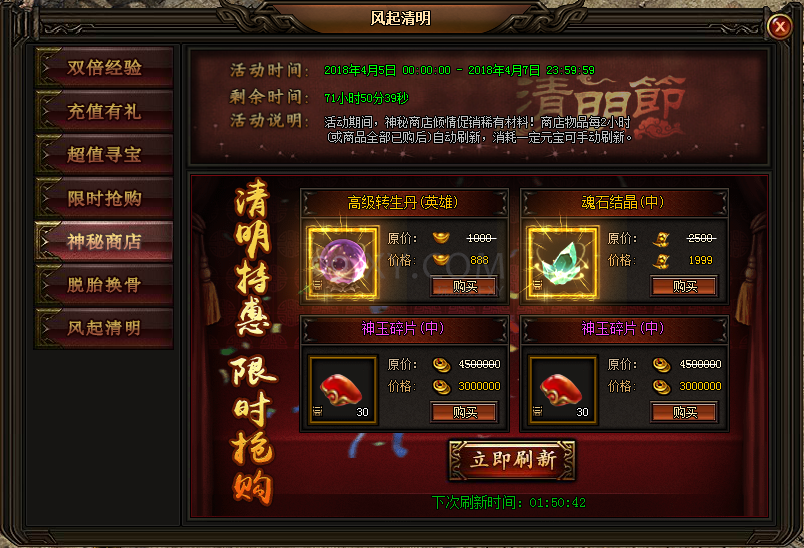 5.4月5日至4月7日,神秘商店促销稀有材料!商店物品每2小时或商品全部购买后自动刷新,也可消耗一定元宝手动刷新!