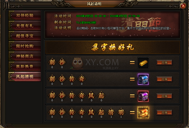 7.4月5日至4月7日,击败BOSS和小怪可掉落文字,也可在积分装备处兑换稀有文字,集齐文字组合即可兑换相应的奖励