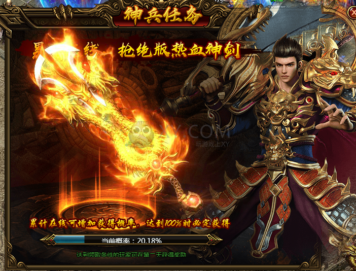 开启热血装备的首要前提就是拥有一把属于自己的热血神剑。不充值,不挖宝,只要次日上线就可以免费获得热血神剑,对于所有玩家来说,大家的起点都是一样的哦,记得第二天要上线~