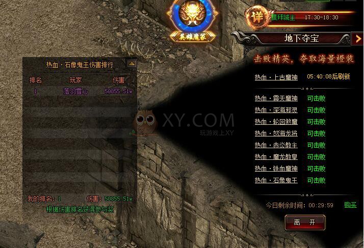 有了热血神剑,那么玩家就可以向地下宫殿进发了。每日可免费进入三次,之后进入每次要花费888礼券,每次进入地下宫殿的时间是30分钟,如果想继续探索地下宫殿,可以用元宝续费时间,续费次数是三次,每次续15分钟,价格随着续费次数递增分别是100YB,200YB;300YB,所以说一次在地宫停留的时间最长75分钟。