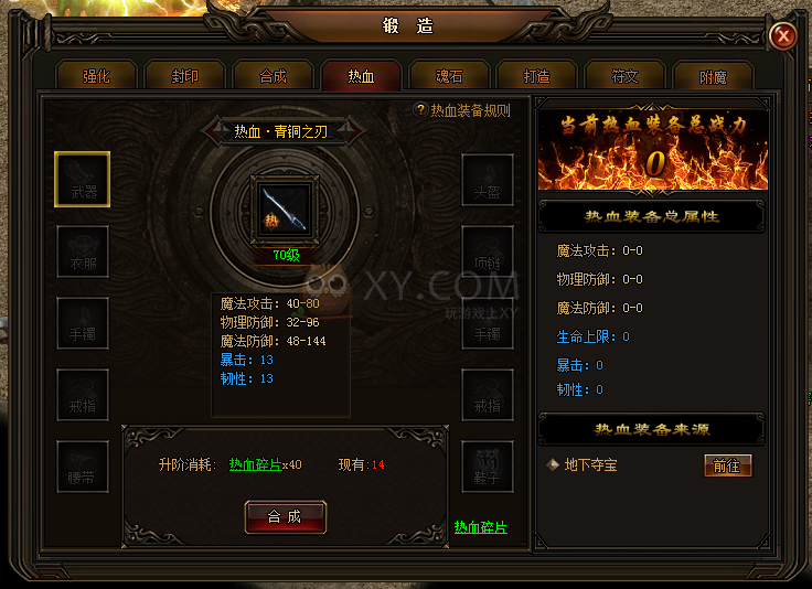 击杀BOSS将会获得数量不等的热血碎片,积累一定数目的碎片,即可在锻造界面激活和升级热血装备了!