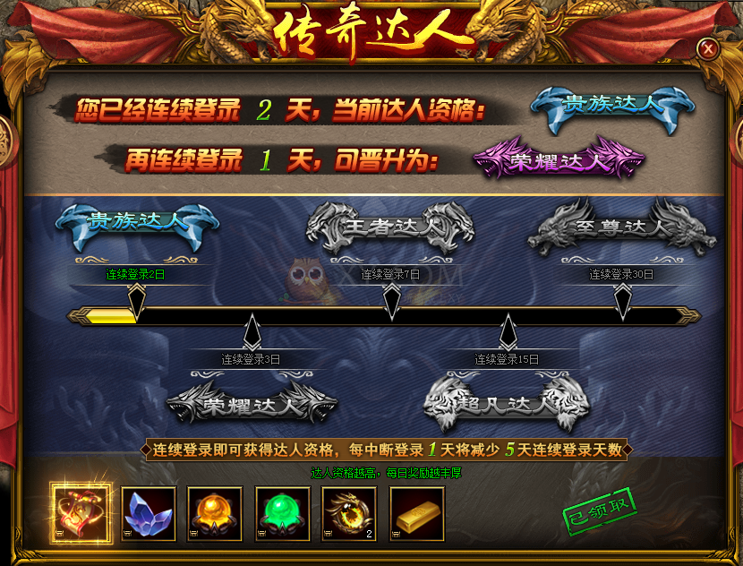 新版本还开启了传奇达人的活跃玩法。累计登陆到一定的天数,即可获得不同等级的达人资格,并且每天可以免费领取丰厚的达人奖励,达人资格约高,奖励越丰厚。注意哦~断签可是会一夜回到解放前,记得每天来登陆,做传奇达人!