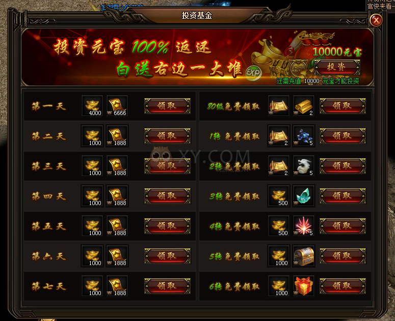 精打细算的玩家爸爸们一定发现了新投放的投资基金项目!只要投入100元,七天不仅可以全数收回,还能额外获得17994礼券。七天内努力提升转生等级到6转还可以将所有额外奖励拿回家,其中就有热血装备宝箱,免费1转热血装备,免去升级烦恼,就等玩家爸爸们的小红手来拿~