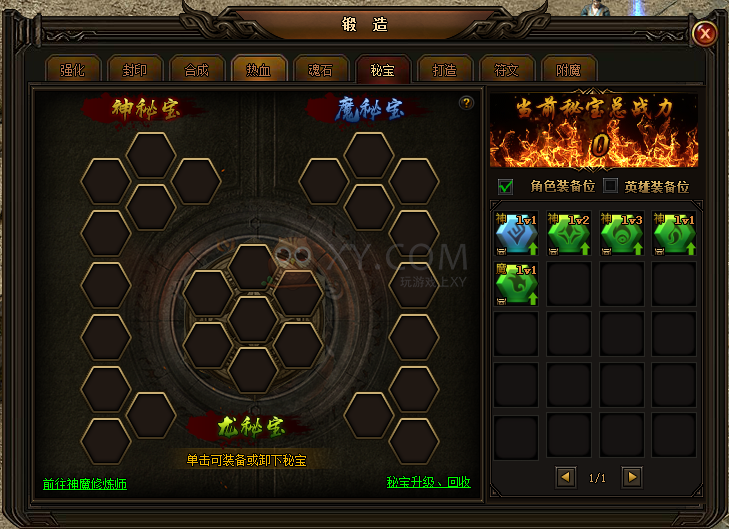 1. 新增秘宝系统(角色等级75级以上在锻造界面开启秘宝系统)