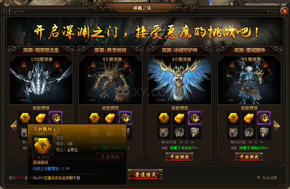 神魔之塔的深渊模式产出10种魔秘宝,魔秘宝主要提升PK的针对性和打BOSS的实力。击杀深渊BOSS有机会获得不同品级的魔秘宝和秘宝精华,深渊BOSS越强大,爆出的魔秘宝品级越高。