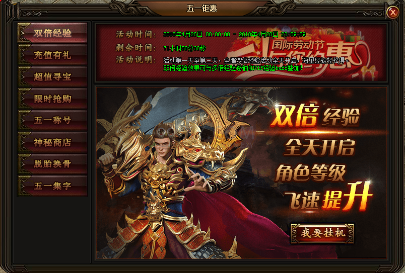 1.4月26日至4月28日,全服双倍经验全天开启,可与多倍经验卷轴和VIP经验BUFF完美叠加!