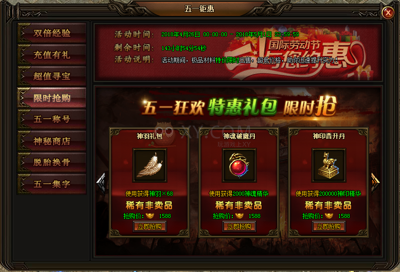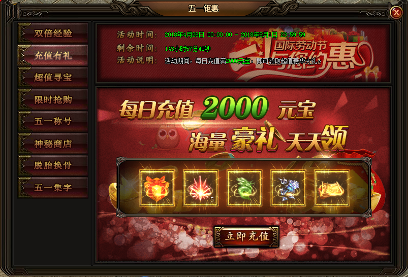 2. 4月26日至5月1日,每日充值2000元宝,即可领取超值豪华大礼