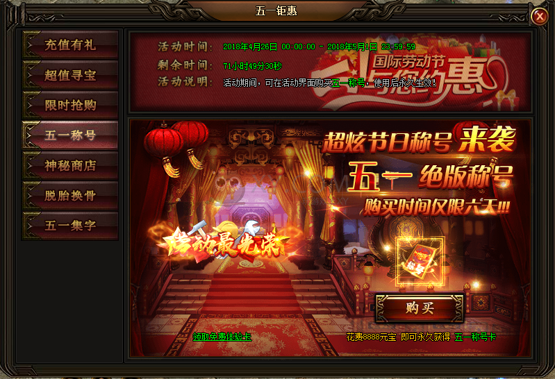 6.4月26日至5月1日,活动期间购买五一称号,使用后永久生效。