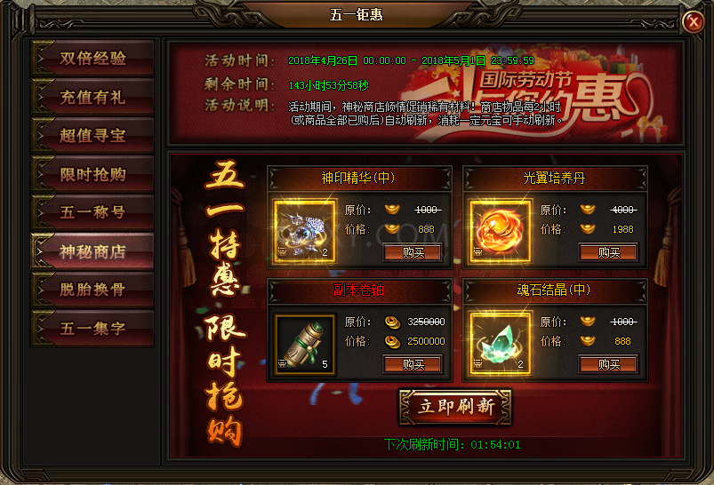7.4月26日至5月1日,神秘商店促销稀有材料!商店物品每2小时或商品全部购买后自动刷新,也可消耗一定元宝手动刷新!