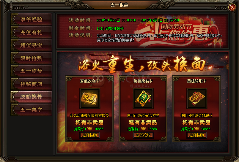 8. 4月26日至5月1日,可购买家族改名卡、角色改名卡和英雄转职卡,每张卡限购1次,预购从速!