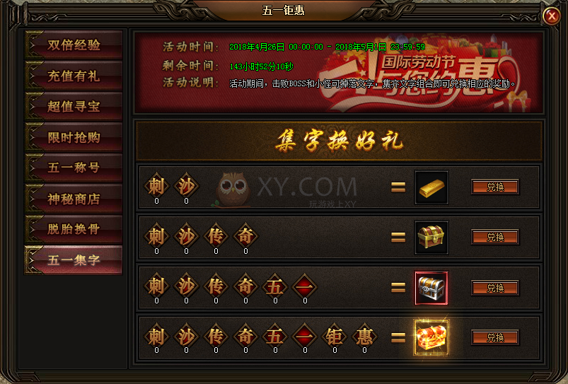9.4月26日至5月1日,击败BOSS和小怪可掉落文字,也可在积分装备处兑换稀有文字,集齐文字组合即可兑换相应的奖励